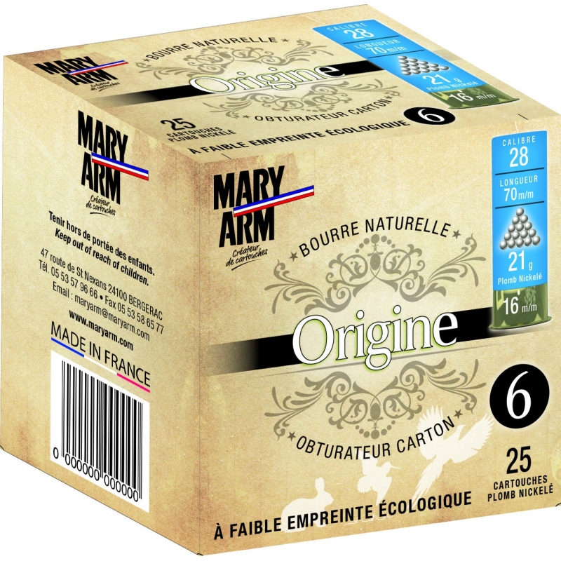 La gamme «Origine» se décline en 3 calibres : 12, 20 et 28. Ces cartouches ont été conçues pour assurer une nature de projectile plus respectueuse de l’environnement grâce à la bourre en fibre de bois aggloméré et l’obturateur carton. Le plomb nickelé, qui vient compléter ce chargement, permet d’assurer un maximum d’efficacités balistiques dans toutes les conditions de tir. Les ciblages à plus de 35 m donnent une gerbe particulièrement homogène et ce, dans les 3 calibres.